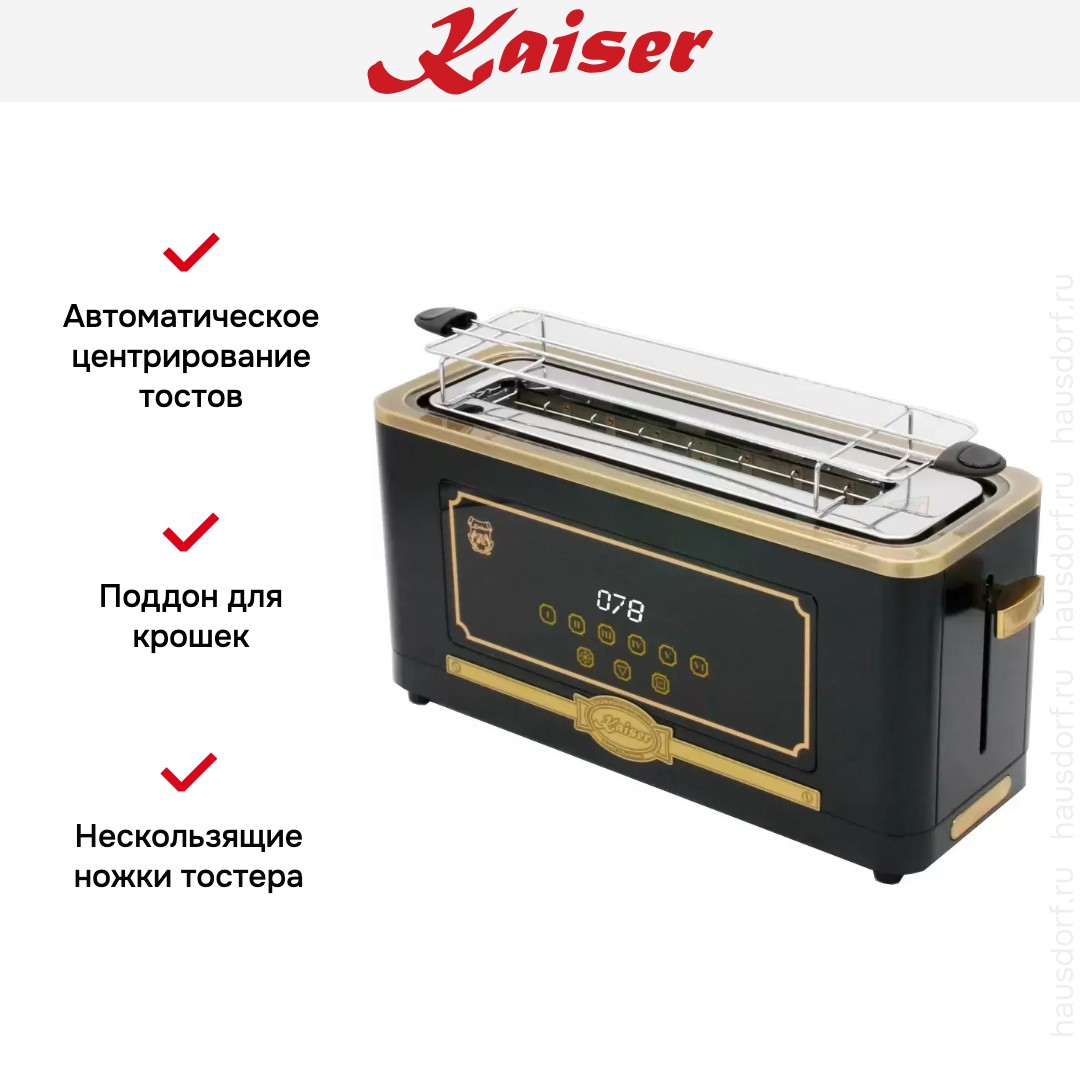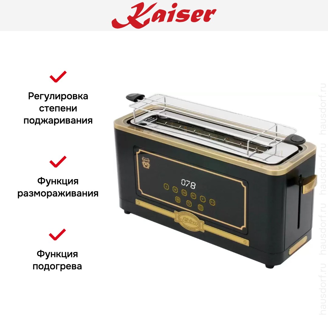 Стильный тостер Kaiser имеет компактный корпус на устойчивых ножках, благодаря которым не пошатывается, даже если хлеб выпрыгивает вверх в конце приготовления. Его главный оттенок — черный. Простое и понятное механическое управление позволяет быстро разобраться во всех функциях. Простое и понятное электронное управление позволяет быстро разобраться во всех функциях. На корпусе расположены сенсорные переключатели для изменения настроек. Благодаря небольшому дисплею еще удобнее следить за процессом.