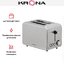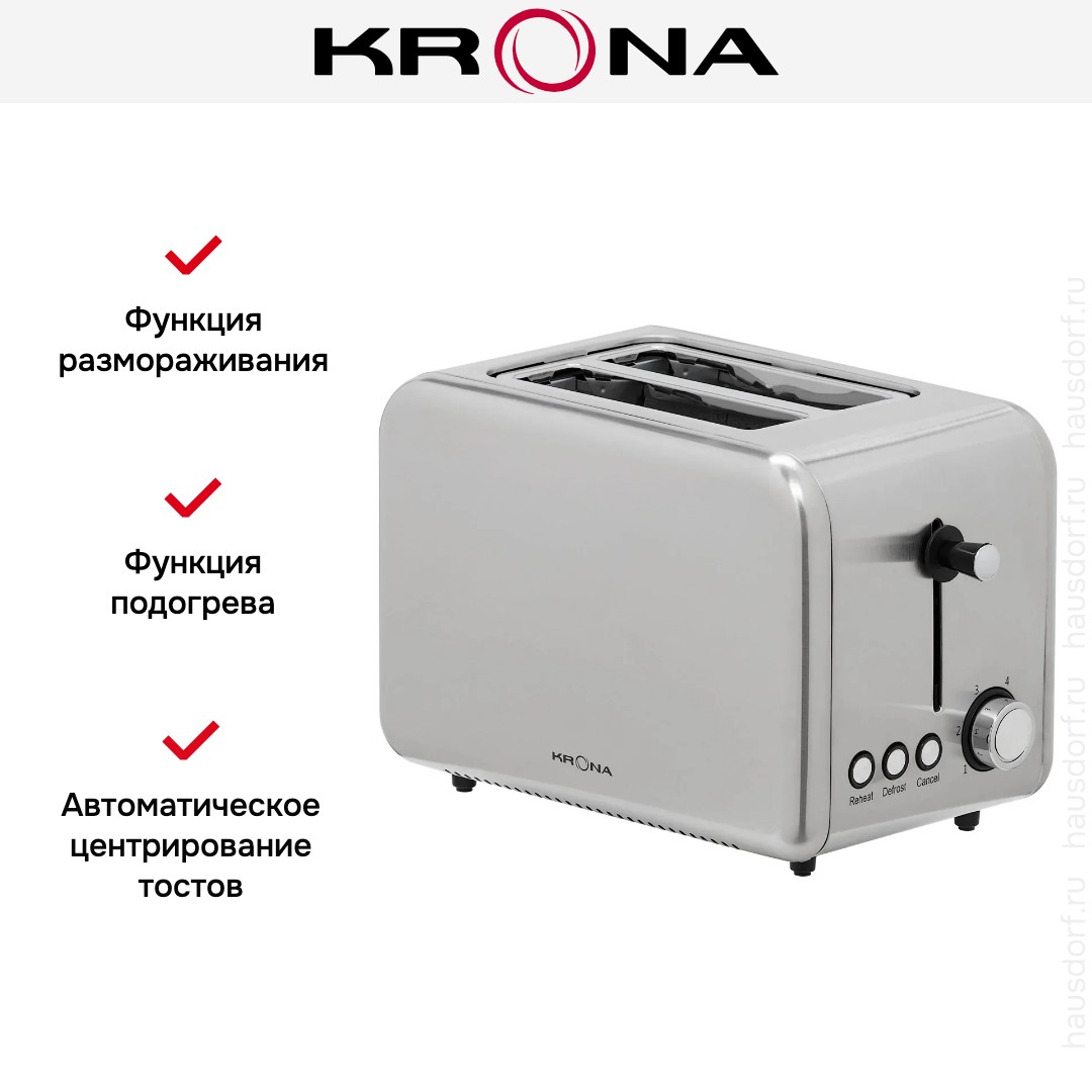 Тостер KRONA Stahl Inox — элегантное и функциональное устройство, созданное для ежедневного использования на современной кухне. Этот стационарный прибор сочетает в себе прочность, стиль и продуманную эргономику, обеспечивая безупречный результат при минимальных усилиях. Его корпус выполнен из высококачественной нержавеющей стали, что не только придаёт технике благородный внешний вид, но и гарантирует устойчивость к коррозии, царапинам и длительному износу. Благодаря компактным габаритам — 18,4 см в высоту, 28,5 см в ширину и 16 см в глубину — устройство легко размещается даже на ограниченной поверхности, не нарушая гармонии интерьера. Внутренние отсеки для хлеба имеют размеры 14 см в высоту и 4 см в ширину, что позволяет подрумянивать как тонкие ломтики, так и более объёмные куски, включая багеты или домашнюю выпечку. Вес прибора составляет всего 1,35 кг, что делает его мобильным и удобным для перемещения при необходимости. Сетевой шнур длиной 0,8 метра обеспечивает достаточную свободу размещения рядом с розеткой без излишней громоздкости. Простое механическое управление позволяет легко регулировать степень прожарки, а функция автоматического отключения повышает безопасность эксплуатации. Устройство оснащено поддоном для сбора крошек, упрощающим уход и поддержание чистоты на рабочей зоне. Благодаря равномерному распределению тепла тосты получаются хрустящими снаружи и мягкими внутри, сохраняя аромат свежей выпечки. Лаконичный дизайн в серебристом исполнении гармонично вписывается в любую обстановку — от ультрасовременной до классической кухни. Прибор не требует сложного обслуживания: его достаточно периодически очищать от крошек и вытирать корпус влажной тканью. Он станет незаменимым помощником в приготовлении завтрака, быстрого перекуса или канапе к чаю. Надёжная сборка, проверенные материалы и внимание к деталям делают эту модель достойным выбором для тех, кто ценит качество, долговечность и эстетику в бытовой технике.