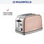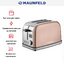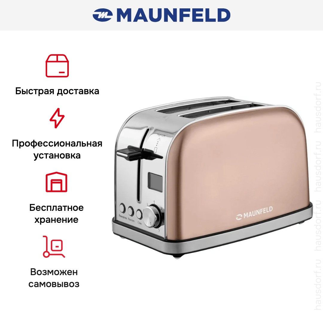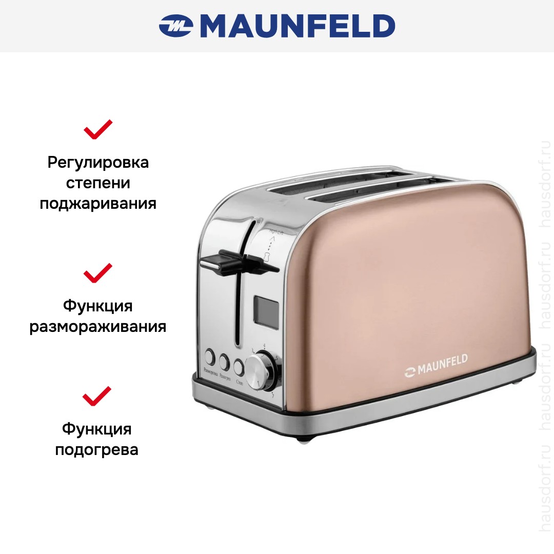 Стильный тостер Maunfeld имеет компактный корпус на устойчивых ножках, благодаря которым не пошатывается, даже если хлеб выпрыгивает вверх в конце приготовления. Основной материал, из которого изготовлен прибор, — нержавеющая сталь. Его главный оттенок — бронза. Простое и понятное механическое управление позволяет быстро разобраться во всех функциях. Простое и понятное электронное управление позволяет быстро разобраться во всех функциях. На корпусе расположены кнопочные+поворотные переключатели для изменения настроек. Благодаря небольшому дисплею еще удобнее следить за процессом.