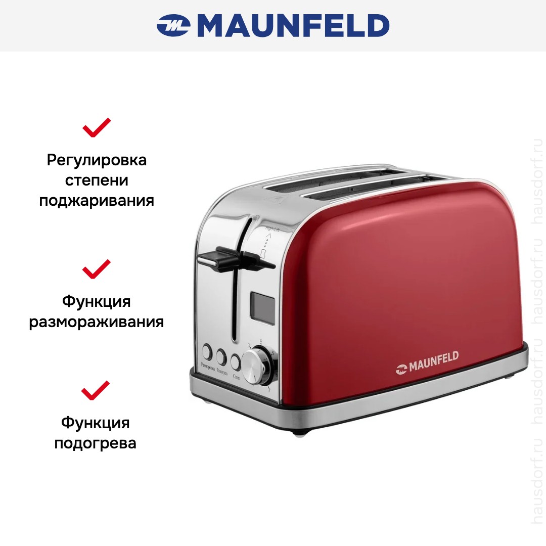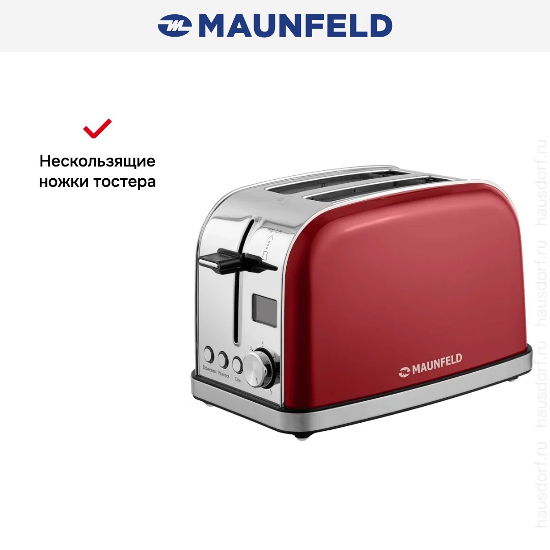 Стильный тостер Maunfeld имеет компактный корпус на устойчивых ножках, благодаря которым не пошатывается, даже если хлеб выпрыгивает вверх в конце приготовления. Основной материал, из которого изготовлен прибор, — нержавеющая сталь. Его главный оттенок — вишня. Простое и понятное механическое управление позволяет быстро разобраться во всех функциях. Простое и понятное электронное управление позволяет быстро разобраться во всех функциях. На корпусе расположены кнопочные+поворотные переключатели для изменения настроек. Благодаря небольшому дисплею еще удобнее следить за процессом.