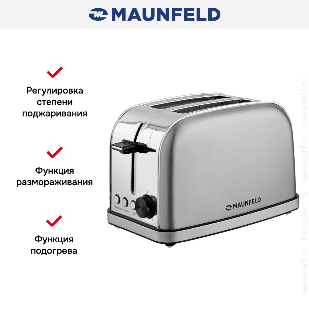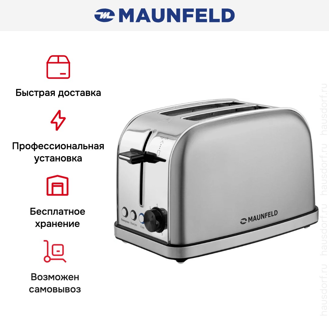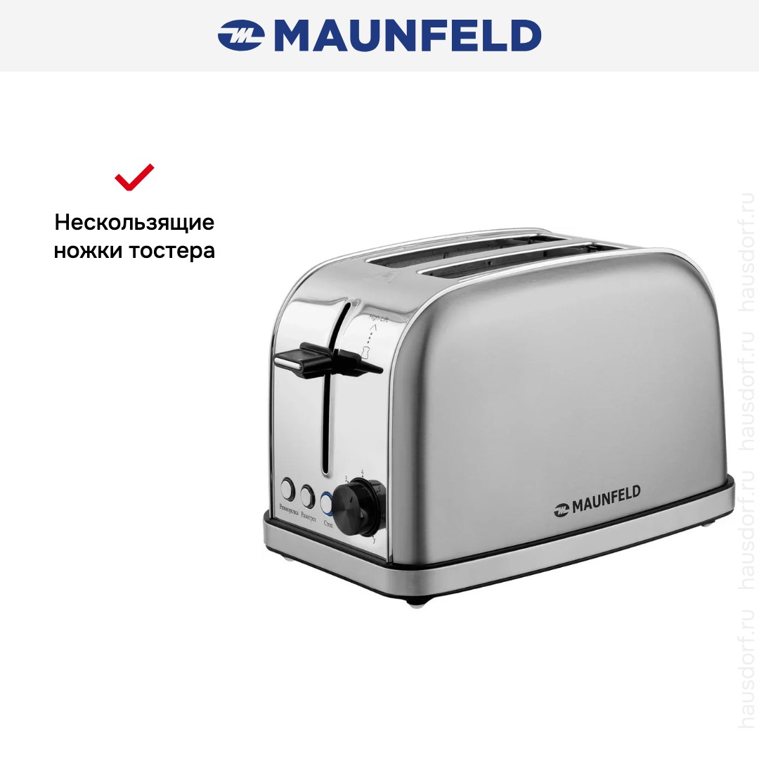Тостер Maunfeld MF-822S. Элегантный корпус из нержавеющей стали придаёт прибору аккуратный современный вид и долговечность. Компактные габариты 18×27×15 см и масса 1,2 кг позволяют разместить устройство даже на ограниченной столешнице. Короткий сетевой шнур 0,75 м стоит учитывать при выборе места, но он же делает прибор аккуратным и безопасным на кухне без лишних проводов. Хромированная поверхность легко очищается от брызг и масляных следов, при этом материал устойчив к коррозии и механическим воздействиям.