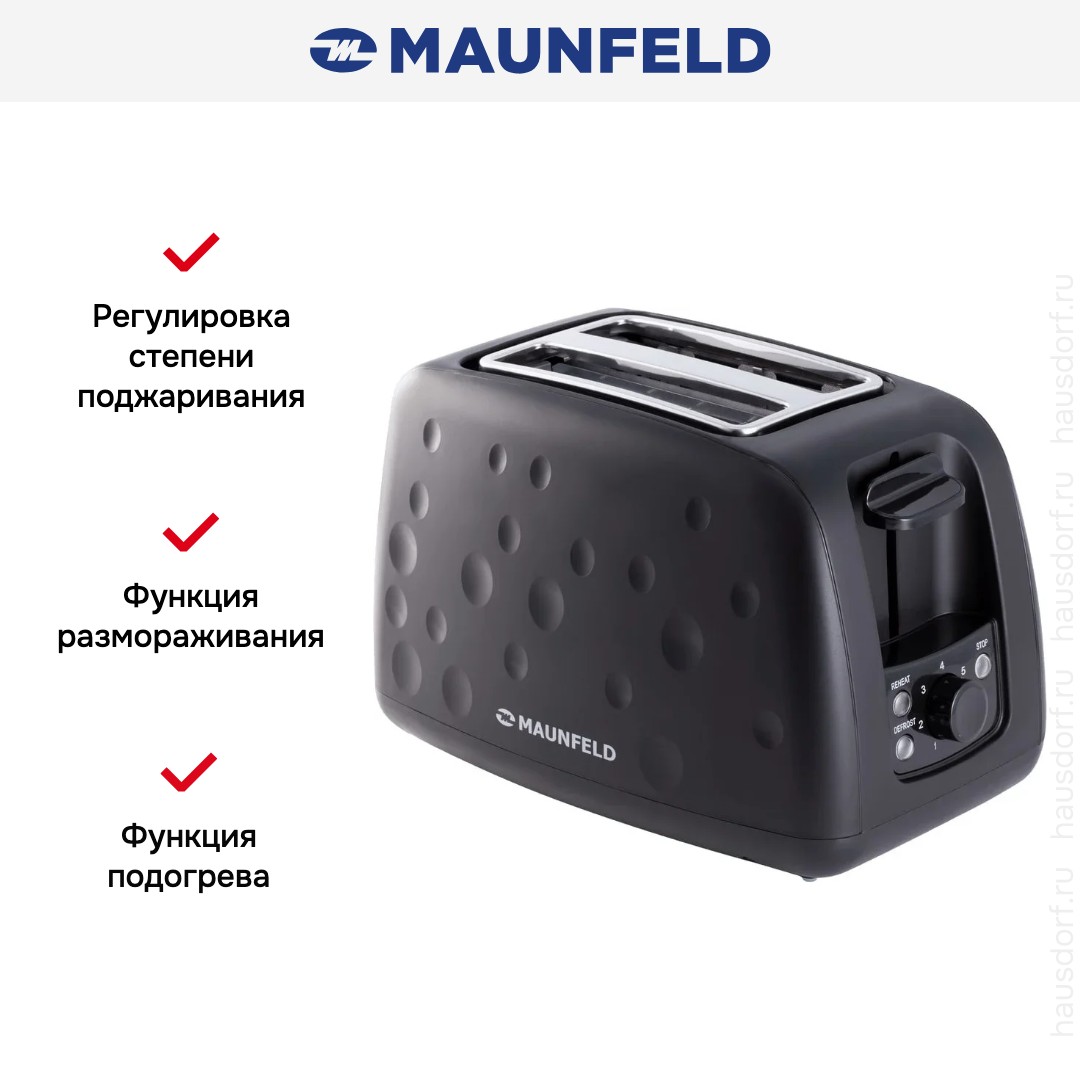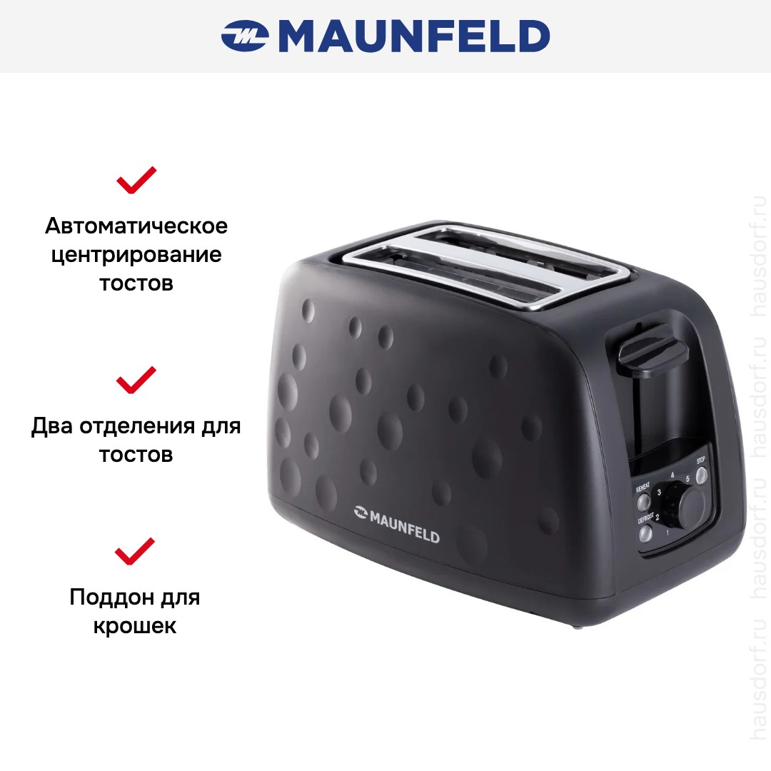 Тостер Maunfeld MFT-847BK представляет собой компактный кухонный прибор в элегантном черном цвете, который гармонично впишется в интерьер современной кухни. Корпус из сочетания пластика и стали придает устройству стильный вид и одновременно обеспечивает необходимую прочность, а термоизолированная оболочка защищает корпус от перегрева во время работы.