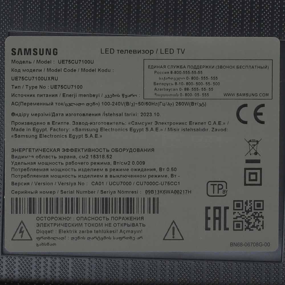 Тип экрана: LED. Диагональ, ": 75. Цвет: черный. Разрешение, px: 3840х2160. Формат: 16:9.