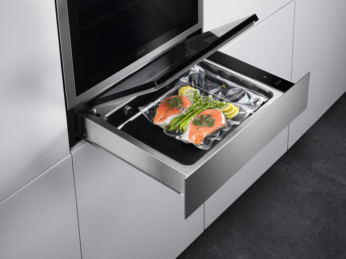 AEG KDE911423M — выдвижной ящик для вакуумной упаковки. Фронт модели выполнен из нержавеющей стали с покрытием AntiFingerPrint, защищающим внешнюю поверхность от следов отпечатков пальцев. Сенсорная панель управления и светодиодный дисплей повышают уровень комфорта и позволяют наиболее точно контролировать работу устройства.