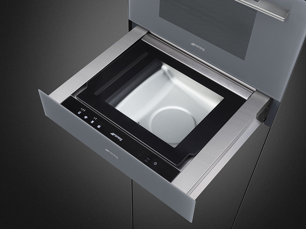 Чтобы открыть рабочую камеру, достаточно нажать на фронтальную панель — не нужны отдельные кнопки или ручки, благодаря чему прибор отлично вписывается в «бесшовный дизайн» наряду с другой встраиваемой техникой. Некоторые модели открываются на всю глубину, некоторые нет — и чтобы полностью открыть рабочую поверхность, нужно выдвинуть ее рукой.