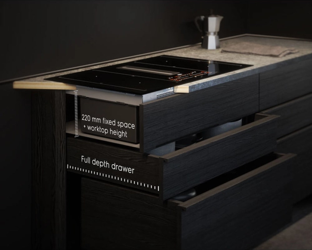 Индукционная зона нагрева отличается мгновенным откликом, точной регулировкой температуры и экономичным расходом электроэнергии. Тепло возникает только при контакте с подходящей посудой, а сама стеклокерамическая плоскость остаётся прохладной в нерабочих участках, что повышает безопасность, особенно в домах с детьми. Встроенная вытяжка эффективно устраняет пар, кулинарные ароматы и жировые испарения прямо у источника, избавляя от необходимости устанавливать громоздкие настенные или островные вентиляционные системы.
