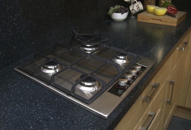 В среднем у газовых моделей этот показатель больше, чем у электрических. Высота газовых варочных поверхностей составляет обычно от 4 до 10 см: важное значение при выборе модели имеет и толщина столешницы. Известно, что стандартная толщина столешницы из ДВП составляет около 38 мм: исходя из этого, высота газовых варочных панелей чаще всего составляет 4–5 см. Если варочная панель имеет большую высоту, ее обычно заглубляют в столешницу, стараясь при этом не повреждать внутреннюю сторону. Для этого под ней устанавливают дополнительную полку (фальшпанель), за счет которой уменьшается пространство в тумбе.