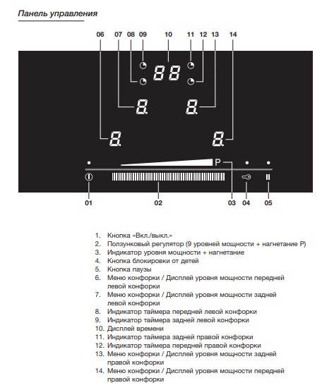 Элементы управления варочной панелью позволяют включать и выключать прибор, регулировать интенсивность нагрева, активировать дополнительные функции — временно увеличивать мощность, подключать контуры расширения конфорок, объединять зоны нагрева, задействовать защиту от детей, экстренно выключать все конфорки сразу и многое другое.
