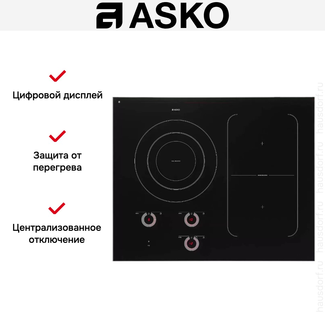 Asko HI1694G — варочная поверхность независимого типа установки. Модель снабжена тремя индукционными конфорками, две из которых можно объединить в единую зону нагрева. Для безопасной эксплуатации предусмотрены функция блокировки панели управления и система индикации остаточного тепла.
