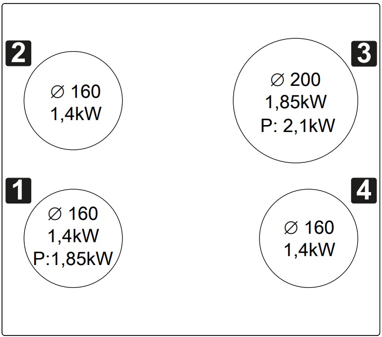 Ширина варочной панели — одна из важнейших ее характеристик, которая зависит главным образом от количества и порядка размещения конфорок. Тип нагрева на нее практически не влияет. Как правило, конфорки размещаются в два ряда, причем более мощные располагаются во втором ряду. Производители выпускают также модели с одним рядом конфорок — например, для установки на кухонном острове, — а также с расположением зон нагрева в форме ромба или трапеции.