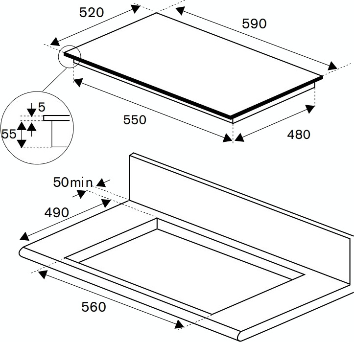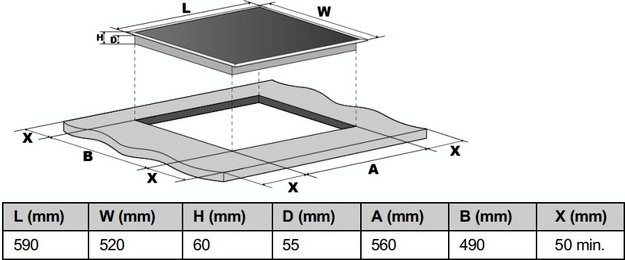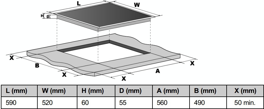 Это независимая индукционная поверхность шириной 59 см, идеально соответствующая стандартным габаритам кухонных модулей. Для встраивания требуется ниша размером 56×49 см, а минимальная высота корпуса — всего 5 см — обеспечивает плотное и аккуратное размещение в столешнице. Индукционная технология гарантирует мгновенный отклик, высокую энергоэффективность и безопасность: нагрев происходит только в нижней части подходящей посуды, а стеклокерамика вне зоны контакта остаётся прохладной.