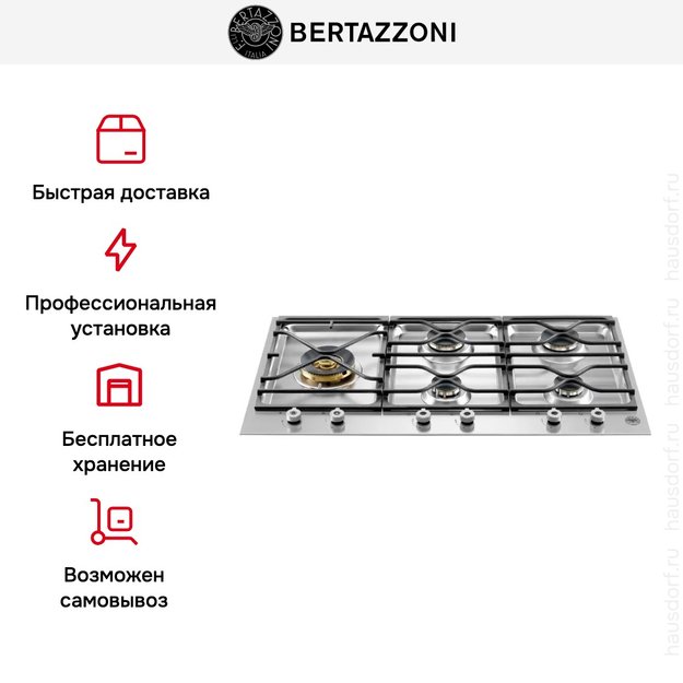 Bertazzoni PM365S0X— независимая газовая варочная панель из серии Professional. Поверхность изготовлена из прочной и эстетичной нержавеющей стали. Модель шириной 90 см рассчитана на установку в просторной кухне. В левой части панели находится конфорка Dual WOK мощностью 5 кВт с двумя рядами пламени, справа располагаются две стандартные конфорки, конфорка быстрого нагрева мощностью 3 кВт и малая конфорка. Для удобной бесступенчатой регулировки мощности служат механические поворотные переключатели. Электроподжиг позволяет включать конфорки поворотом рукоятки. Система «Газ-контроль» обеспечивает безопасность использования: подача газа прекращается автоматически, если пламя погаснет.
