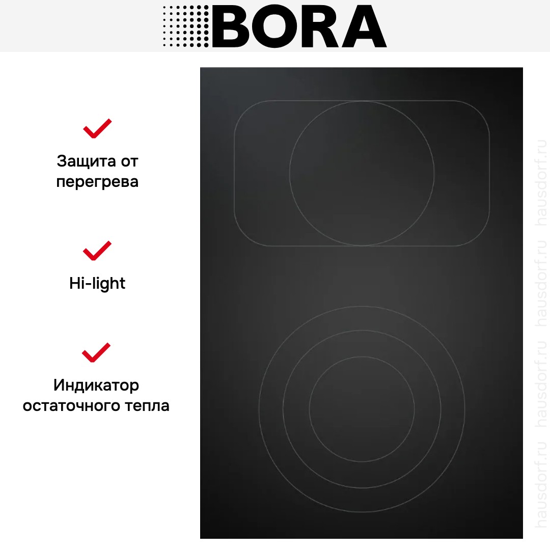Варочная панель BORA PKCB3AB — компактный независимый электрический прибор, выполненный в строгом черном цвете. Габариты 7.3×37×54 см и тонкий профиль всего 7.3 см делают устройство идеальным решением для тесной кухни, где нет лишнего места. Отсутствие рамки обеспечивает плавный переход к рабочей поверхности, а черная стеклокерамика придает технике стильный вид. Покрытие не только эффектно выглядит, но и легко очищается.