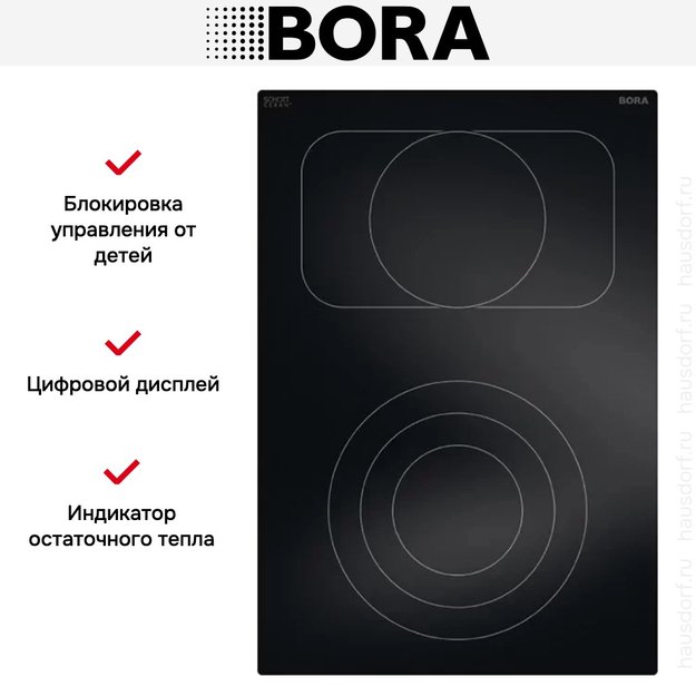 Варочная панель BORA PC3B — узкая варочная панель со стеклокерамической панелью конфорок. Модель оборудована двумя электрическими зонами нагрева с девятиступенчатой системой регулировки уровня мощности. Индикация остаточного тепла и функция защиты от детей гарантируют безопасную эксплуатацию устройства.