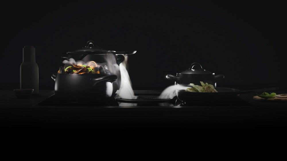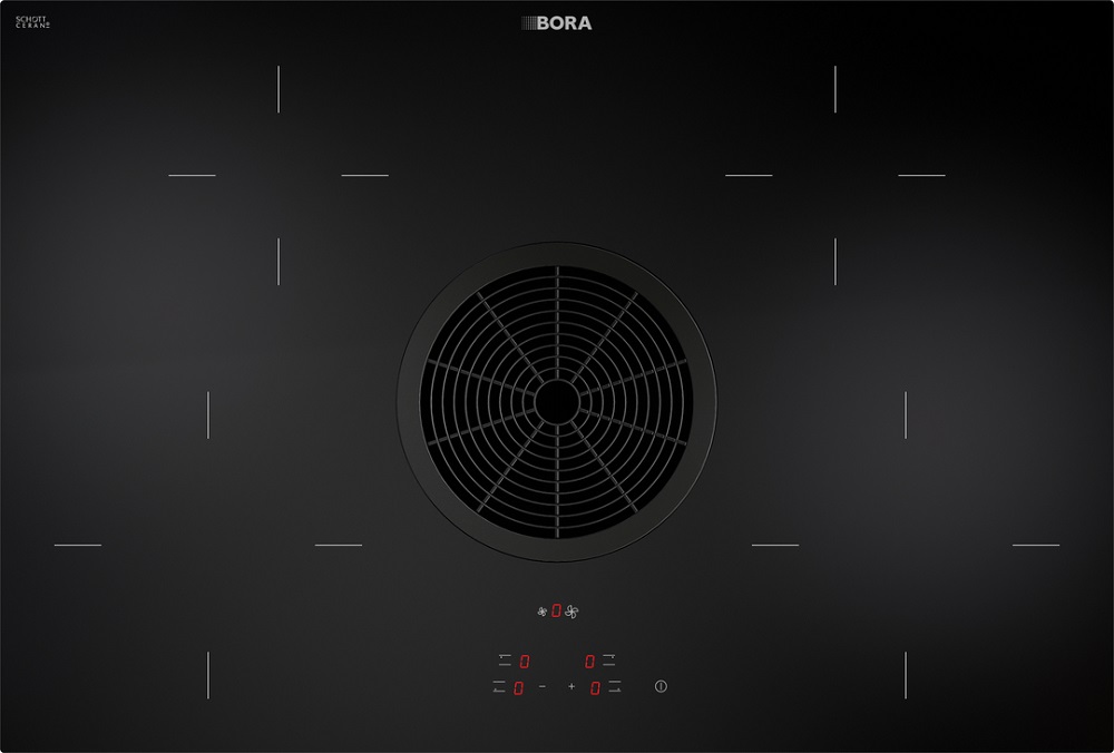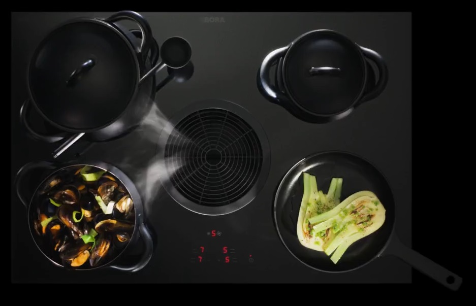 Вытяжка, встроенная в варочную панель — достаточно удобный вариант, позволяющий сэкономить место в кухне. Такая конструкция позволяет лучше улавливать испарения, не давая им распространяться по всему помещению, и способствует более качественной очистке воздуха. Большинство подобных моделей может работать только в режиме рециркуляции воздуха, с удалением капель жира, сажи, неприятных запахов при помощи системы фильтров. Работу в режиме отвода загрязненного воздуха через систему вентиляции организовать довольно сложно, поскольку вытяжка располагается низко над полом. Часто варочная панель находится на кухонном острове, что также мешает присоединению к вентиляции. Еще одна особенность подобных моделей состоит в том, что под варочной панелью нельзя разместить духовку или другую технику, так как место будет занято.