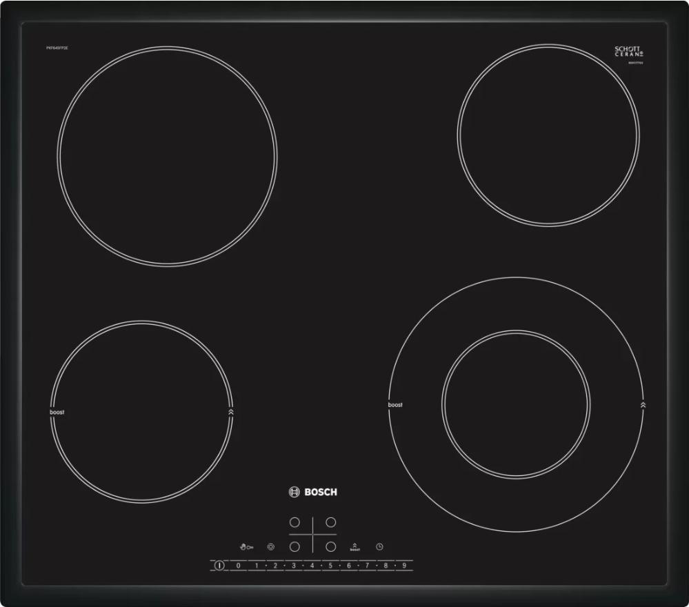 Bosch PKF646FP1 — электрическая варочная поверхность, изготовленная из высокопрочной стеклокерамики. Сенсорная панель управления DirectSelect позволяет менять настройки легким касанием. Благодаря индикации остаточного тепла на остывающих конфорках можно подогревать пищу, растапливать масло или шоколад.