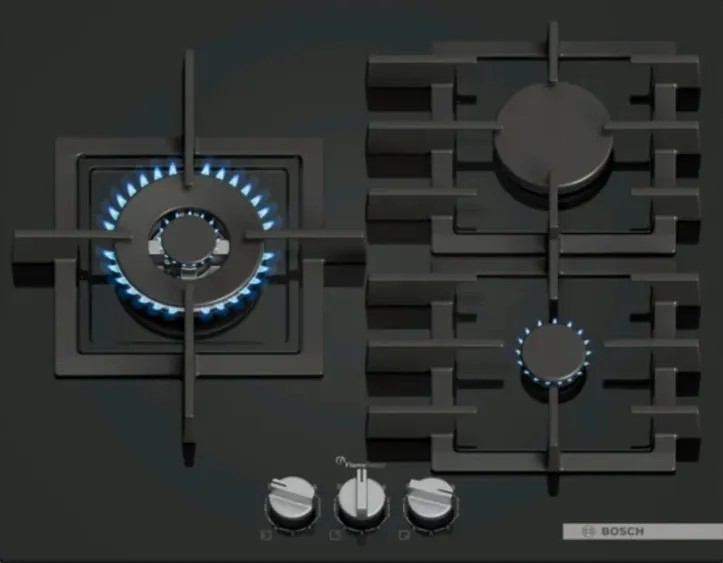 Выбор газовой варочной панели чаще всего обусловлен тем, что в частный дом или квартиру проведен именно газ в качестве обогрева. Работать с этой моделью довольно просто, так как мощность нагрева видна невооруженным взглядом — по силе огня в горелке. Количество конфорок в этой модели: 3.