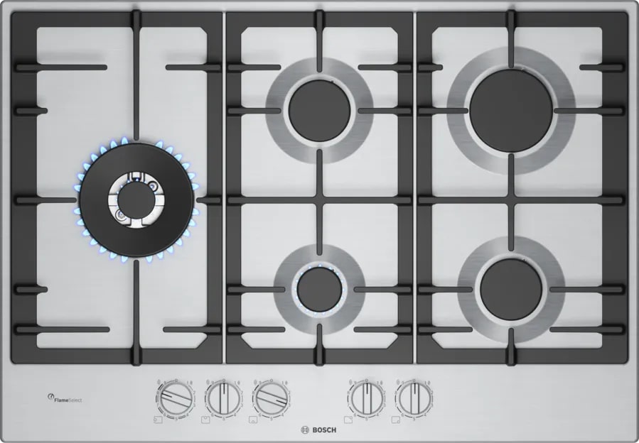 Технология FlameSelect в современных газовых варочных панелях Bosch обеспечивает ступенчатую регулировку пламени на 9 предустановленных уровнях. Конфорки с FlameSelect позволяют точно задавать интенсивность нагрева поворотом специального переключателя, не требуя визуального контроля.