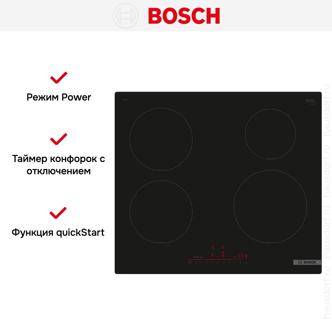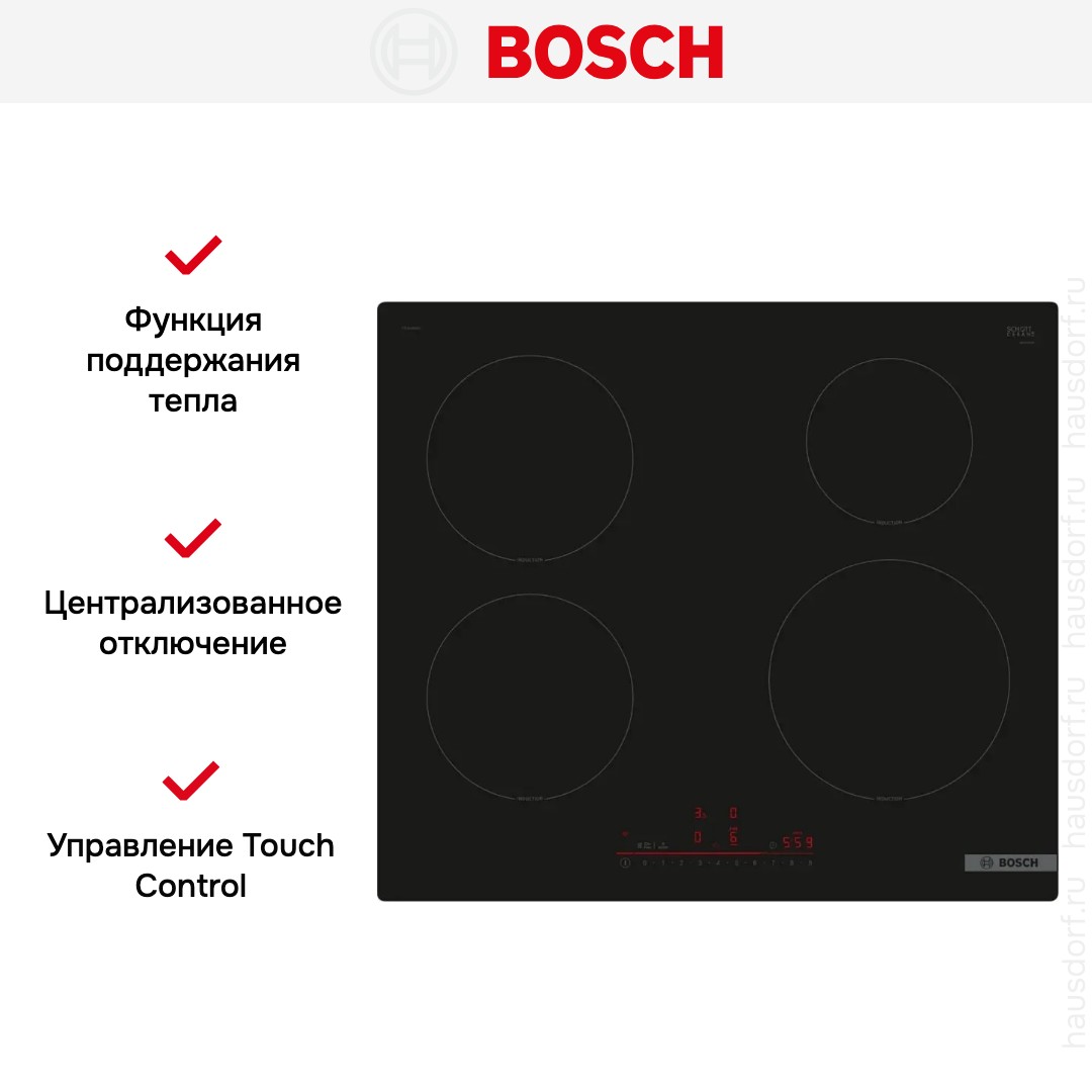 Модель Бош PIE61RHB1E входит в дизайн-линейку: Serie | 6. Цвет — черный. Благодаря отсутствию рамки она отлично впишется в интерьер и не займет лишнее место на столешнице, которое можно использовать для работы. Материал самой поверхности: стеклокерамика. Управление этой моделью электронное. Для переключения уровней нагрева, выбора функций используются следующие переключатели: сенсорные/TouchControl. Продвинутая система контроля за прибором делают его современным и отвечающим на главные запросы покупателя.