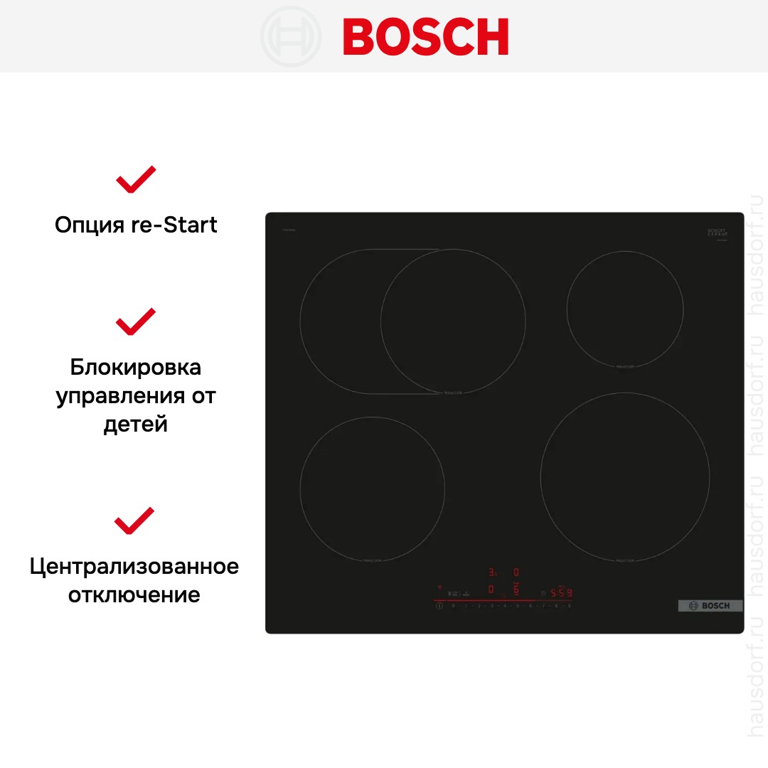 Функция re-Start в индукционных варочных панелях Bosch служит для восстановления настроек приготовления через короткое время после несвоевременного выключения, которое может произойти из-за случайного нажатия на кнопку или из-за попадания на поверхность жидкости или посторонних предметов.