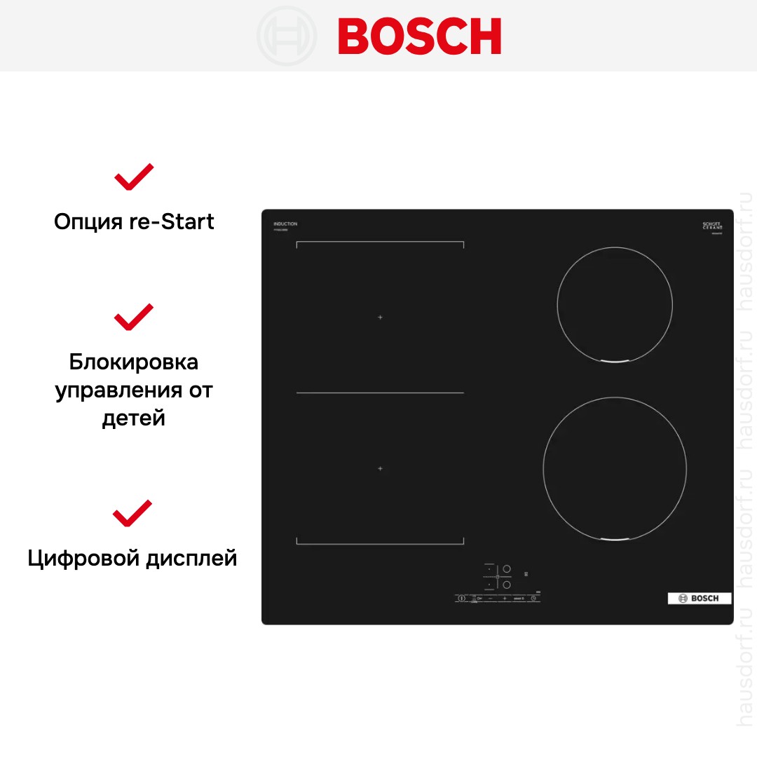Модель Бош PVS611BB6E входит в дизайн-линейку: Serie | 4. Цвет — черный. Материал самой поверхности: стеклокерамика. Управление этой моделью электронное. Для переключения уровней нагрева, выбора функций используются следующие переключатели: сенсорные/TouchControl. Продвинутая система контроля за прибором делают его современным и отвечающим на главные запросы покупателя.