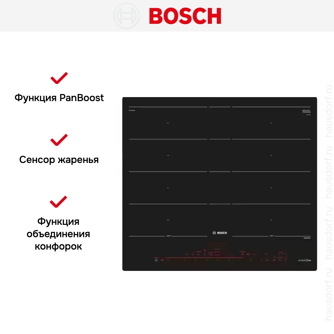 Модель Бош PXY621DX6E входит в дизайн-линейку: Serie | 8. Цвет — черный. Благодаря отсутствию рамки она отлично впишется в интерьер и не займет лишнее место на столешнице, которое можно использовать для работы. Материал самой поверхности: стеклокерамика. Управление этой моделью электронное. Для переключения уровней нагрева, выбора функций используются следующие переключатели: DirectSelection. Продвинутая система контроля за прибором делают его современным и отвечающим на главные запросы покупателя.