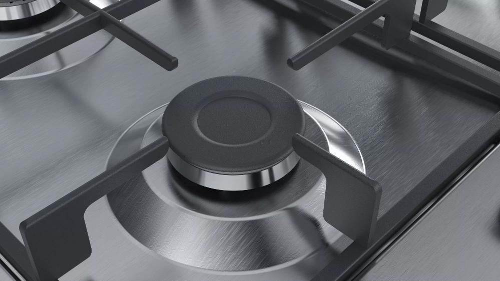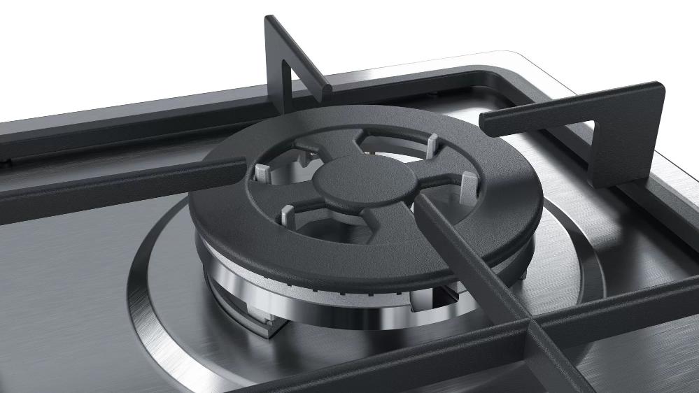 Bosch PGH6B5B60 — газовая варочная поверхность со стальной панелью конфорок. Модель оборудована составной чугунной решеткой и комплектуется форсунками для баллонного газа. Автоматический электроподжиг исключает необходимость использования спичек или зажигалок для активации горелок.
