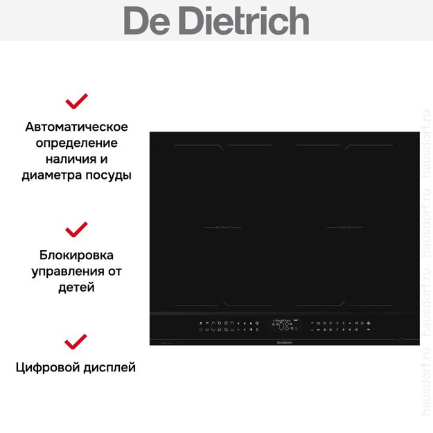 Модель Де Дитрих DPI4441BT входит в дизайн-линейку: Infinite Black. Цвет — черный. Благодаря отсутствию рамки она отлично впишется в интерьер и не займет лишнее место на столешнице, которое можно использовать для работы. Материал самой поверхности: стеклокерамика. Управление этой моделью электронное. Для переключения уровней нагрева, выбора функций используются следующие переключатели: сенсорные/TouchControl. Продвинутая система контроля за прибором делают его современным и отвечающим на главные запросы покупателя.
