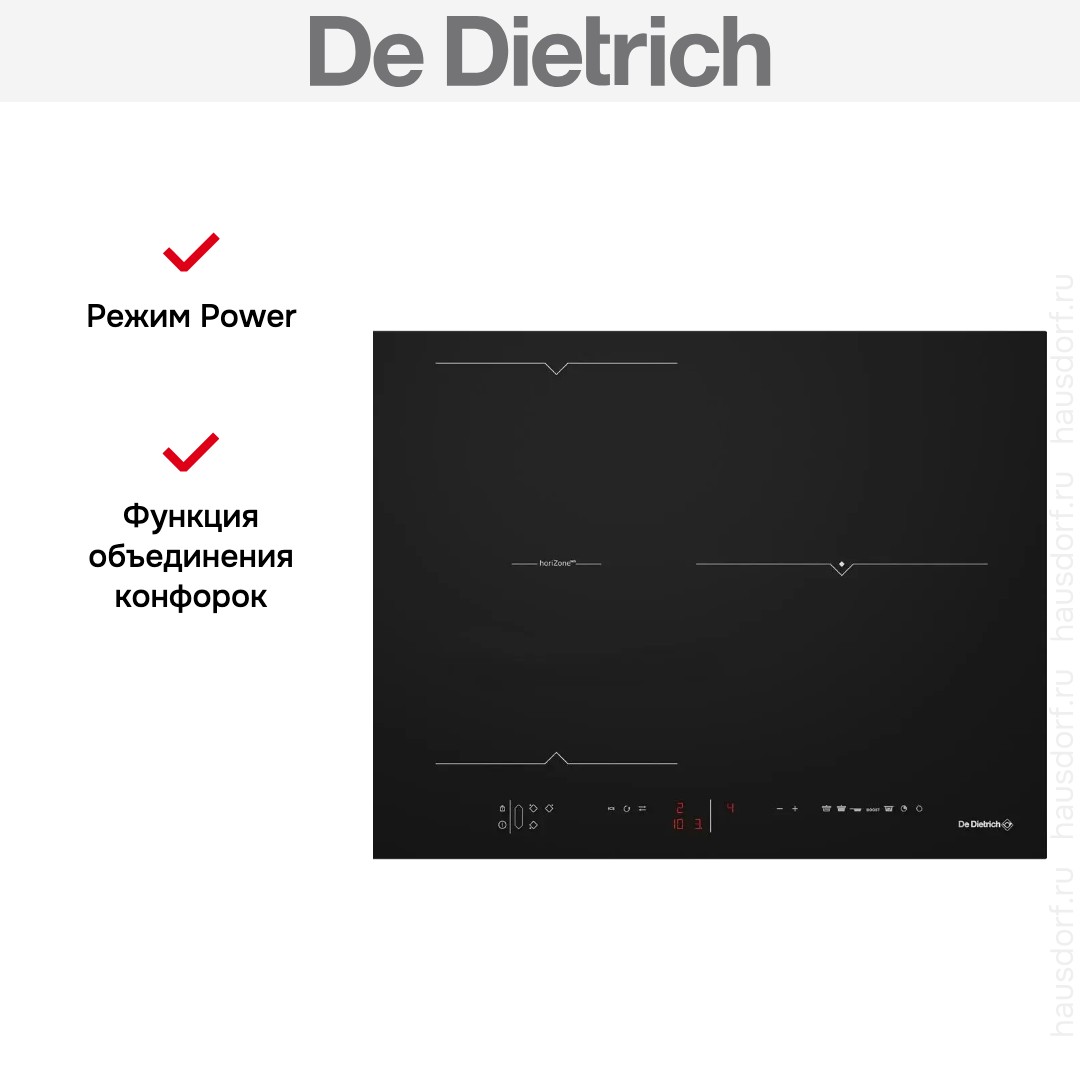 Модель Де Дитрих DPI7580B входит в дизайн-линейку: horiZone Tech. Цвет — черный. Благодаря отсутствию рамки она отлично впишется в интерьер и не займет лишнее место на столешнице, которое можно использовать для работы. Материал самой поверхности: стеклокерамика. Управление этой моделью электронное. Для переключения уровней нагрева, выбора функций используются следующие переключатели: сенсорные/TouchControl. Продвинутая система контроля за прибором делают его современным и отвечающим на главные запросы покупателя.