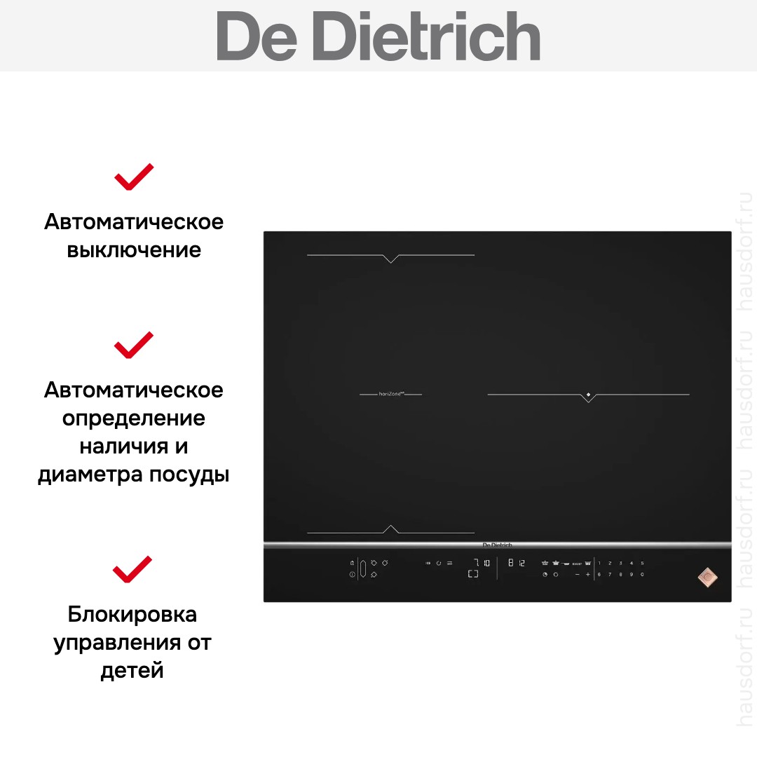 Модель Де Дитрих DPI7584X входит в дизайн-линейку: horiZone. Цвет — черный. Благодаря отсутствию рамки она отлично впишется в интерьер и не займет лишнее место на столешнице, которое можно использовать для работы. Материал самой поверхности: стеклокерамика. Управление этой моделью электронное. Для переключения уровней нагрева, выбора функций используются следующие переключатели: сенсорные/TouchControl. Продвинутая система контроля за прибором делают его современным и отвечающим на главные запросы покупателя.