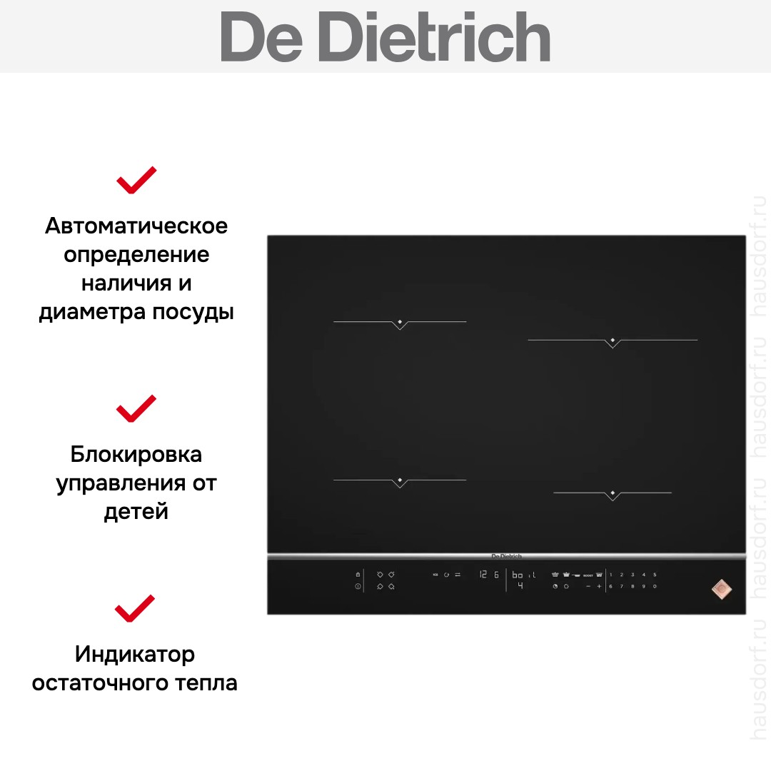 De Dietrich DPI7670XU — индукционная варочная панель с системой управления мощностью подключения к электрической сети. Модель снабжена четырьмя разноразмерными зонами нагрева с автоматикой распознавания посуды. Для контроля времени приготовления предусмотрен электронный таймер, программируемый отдельно для каждой из конфорок.