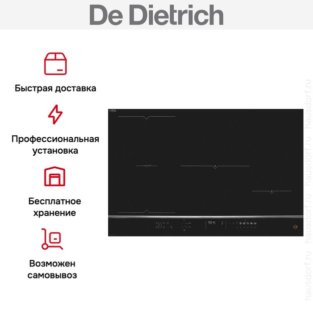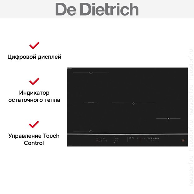 Модель Де Дитрих DPI7884XT входит в дизайн-линейку: HoriZone. Цвет — черный. Благодаря отсутствию рамки она отлично впишется в интерьер и не займет лишнее место на столешнице, которое можно использовать для работы. Материал самой поверхности: стеклокерамика SCHOTT CERAN. Управление этой моделью электронное. Для переключения уровней нагрева, выбора функций используются следующие переключатели: сенсорные/TouchControl. Продвинутая система контроля за прибором делают его современным и отвечающим на главные запросы покупателя.