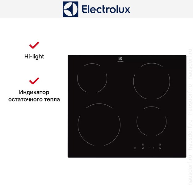 Electrolux EHV 56240 AK — независимая варочная поверхность с четырьмя зонами быстрого нагрева Hi-light. Фронтальное расположение панели управления обеспечивает свободный доступ к сенсорным полям. Для безопасной эксплуатации устройства предусмотрена система индикации остаточного тепла, которая помогает определить какая из конфорок еще не остыла.