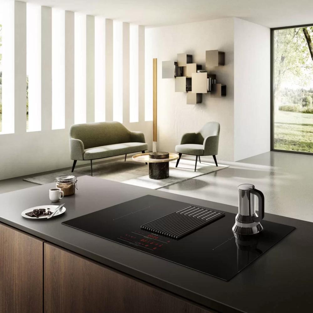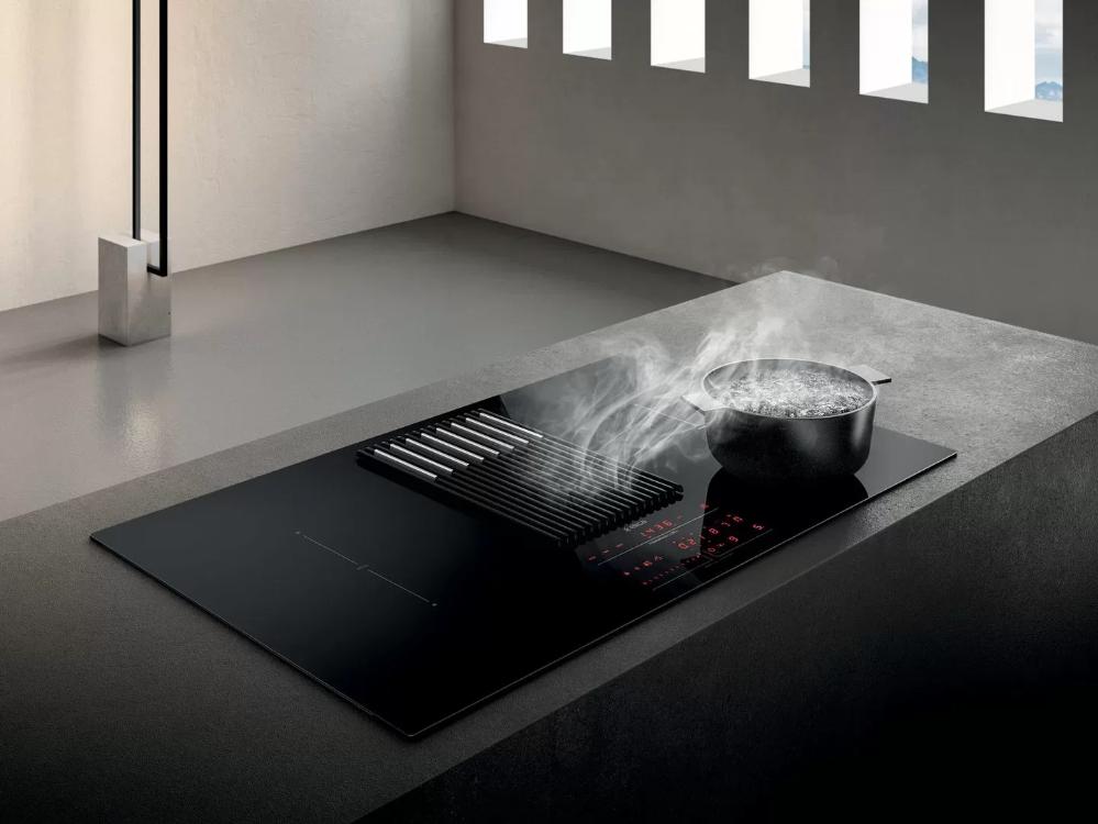 Вытяжка, встроенная в варочную панель — достаточно удобный вариант, позволяющий сэкономить место в кухне. Такая конструкция позволяет лучше улавливать испарения, не давая им распространяться по всему помещению, и способствует более качественной очистке воздуха. Большинство подобных моделей может работать только в режиме рециркуляции воздуха, с удалением капель жира, сажи, неприятных запахов при помощи системы фильтров. Работу в режиме отвода загрязненного воздуха через систему вентиляции организовать довольно сложно, поскольку вытяжка располагается низко над полом. Часто варочная панель находится на кухонном острове, что также мешает присоединению к вентиляции. Еще одна особенность подобных моделей состоит в том, что под варочной панелью нельзя разместить духовку или другую технику, так как место будет занято.