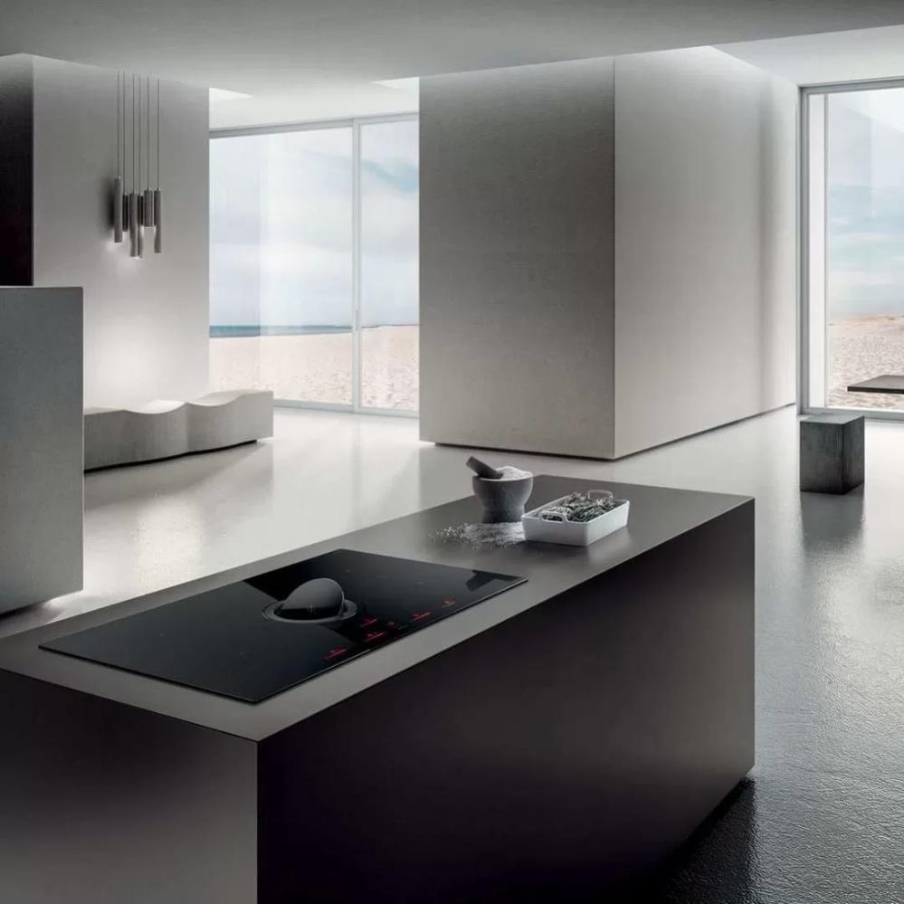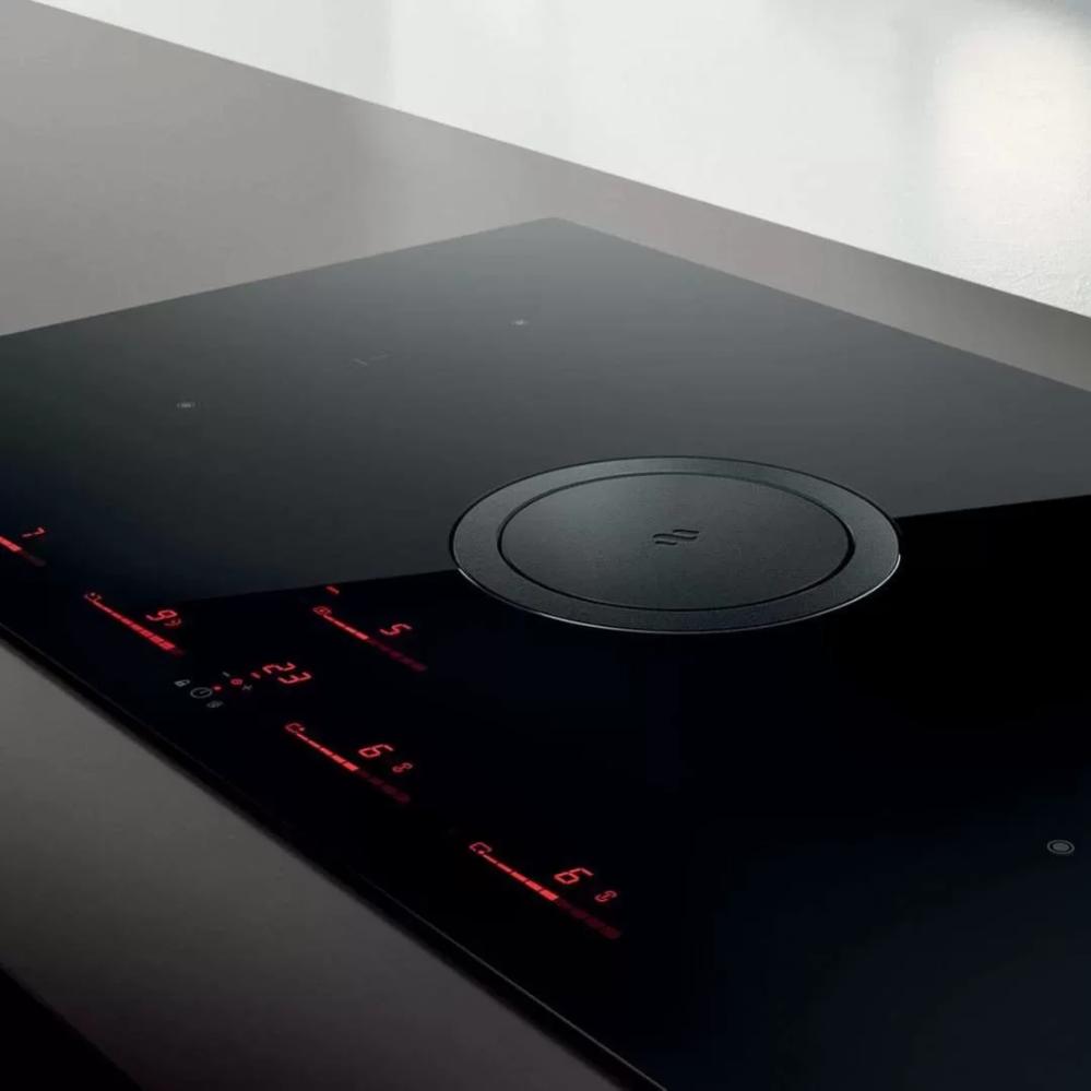 Индукционная варочная панель со встроенной вытяжкой, которая работает в режиме отвода — для рециркуляции нужно дополнительно купить угольный фильтр. Вы можете объединить конфорки, чтобы использовать крупную или нестандартную посуду. Дизайн FABRIZIO CRISÀ удостоен нескольких наград.