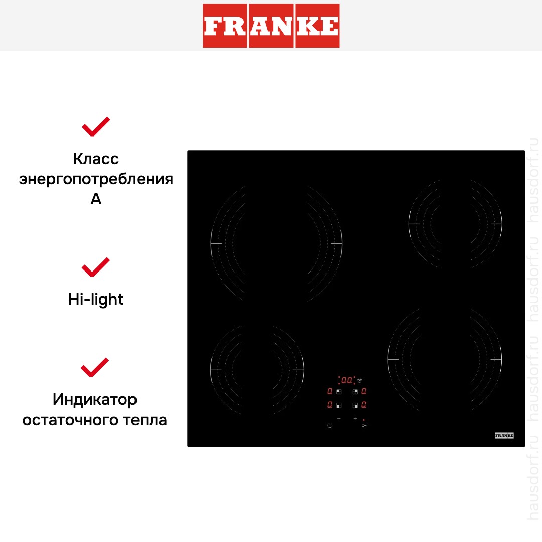 Варочная панель Franke FRSM 604 CT BK — современное решение для кухонь, где важны эстетика, функциональность и передовые технологии. Это независимая электрическая модель с гладкой стеклокерамической поверхностью чёрного цвета и безрамочным дизайном Smart, который придаёт ей лаконичный, почти парящий вид. Благодаря минимальным габаритам — всего 5 см в высоту при ширине 58 см и глубине 51 см — панель легко встраивается в стандартную нишу размером 56×49 см, гармонично дополняя любую кухонную мебель.