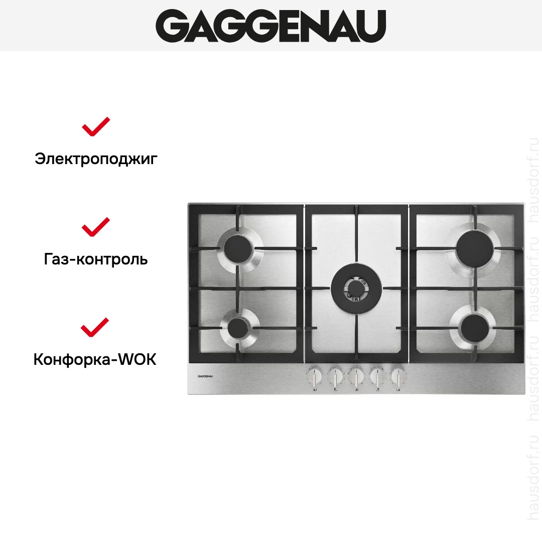 Gaggenau CG 291-210 — газовая варочная поверхность, изготовленная из нержавеющей стали. Модель оборудована пятью конфорками, активация которых осуществляется по системе автоматического электроподжига. Для надежного удержания посуды доступны прочные чугунные решетки с шероховатой поверхностью.