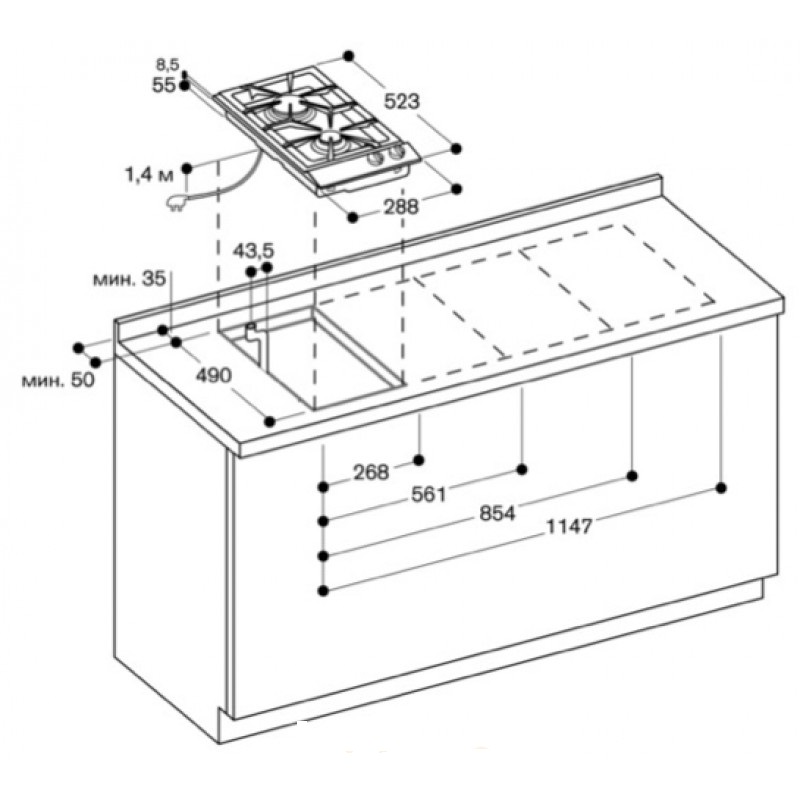 Отверстие в нише выполняют, исходя из размеров самой варочной панели — они должны соответствовать друг другу либо немного превышать размеры выреза. При выборе наиболее распространенной варочной панели с 4 конфорками в столешнице вырезается отверстие шириной 59 см и глубиной около 49-50 см. Толщина столешницы должна быть немного меньше, чем высота варочной панели, в противном случае панель придется заглубить, чтобы она не слишком выступала.