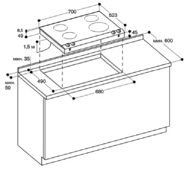 Отверстие в нише выполняют, исходя из размеров самой варочной панели — они должны соответствовать друг другу либо немного превышать размеры выреза. При выборе наиболее распространенной варочной панели с 4 конфорками в столешнице вырезается отверстие шириной 59 см и глубиной около 49-50 см. Толщина столешницы должна быть немного меньше, чем высота варочной панели, в противном случае панель придется заглубить, чтобы она не слишком выступала.