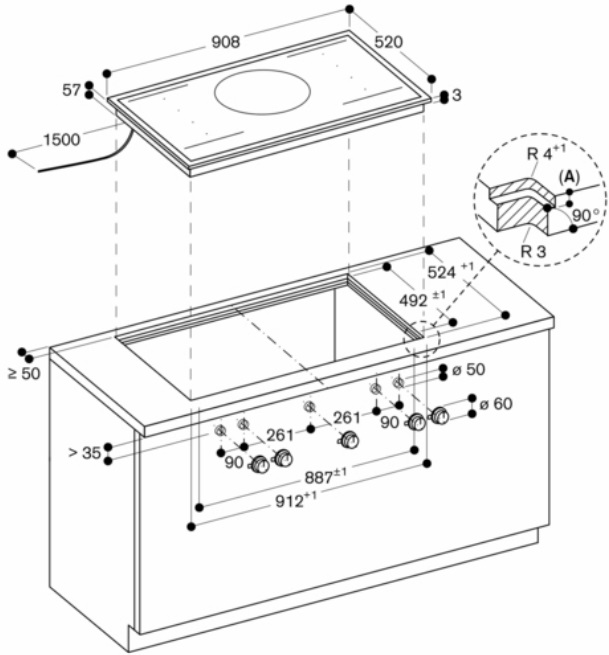 Отверстие в нише выполняют, исходя из размеров самой варочной панели — они должны соответствовать друг другу либо немного превышать размеры выреза. При выборе наиболее распространенной варочной панели с 4 конфорками в столешнице вырезается отверстие шириной 59 см и глубиной около 49-50 см. Толщина столешницы должна быть немного меньше, чем высота варочной панели, в противном случае панель придется заглубить, чтобы она не слишком выступала.