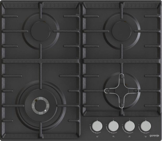 Выбор газовой варочной панели чаще всего обусловлен тем, что в частный дом или квартиру проведен именно газ в качестве обогрева. Работать с этой моделью довольно просто, так как мощность нагрева видна невооруженным взглядом — по силе огня в горелке. Количество конфорок в этой модели: 4. Горелки с двойной короной позволяют увеличивать мощность нагрева в зависимости от диаметра посуды.