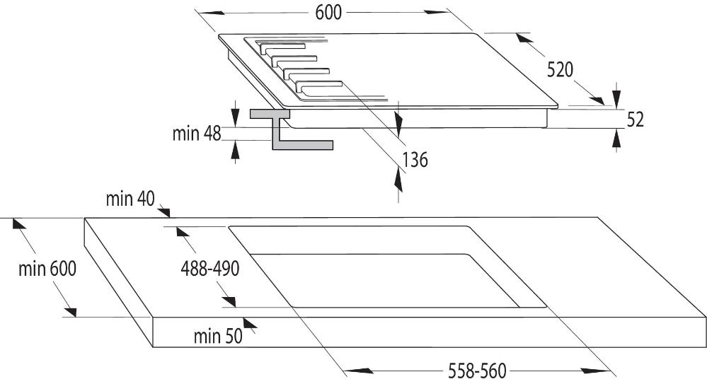 Отверстие в нише выполняют, исходя из размеров самой варочной панели — они должны соответствовать друг другу либо немного превышать размеры выреза. При выборе наиболее распространенной варочной панели с 4 конфорками в столешнице вырезается отверстие шириной 59 см и глубиной около 49-50 см. Толщина столешницы должна быть немного меньше, чем высота варочной панели, в противном случае панель придется заглубить, чтобы она не слишком выступала.