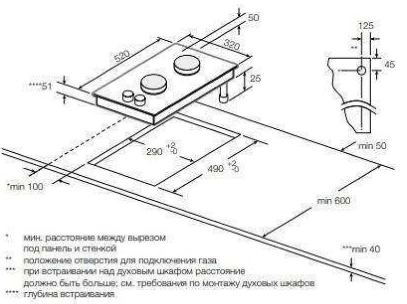 Отверстие в нише выполняют, исходя из размеров самой варочной панели — они должны соответствовать друг другу либо немного превышать размеры выреза. При выборе наиболее распространенной варочной панели с 4 конфорками в столешнице вырезается отверстие шириной 59 см и глубиной около 49-50 см. Толщина столешницы должна быть немного меньше, чем высота варочной панели, в противном случае панель придется заглубить, чтобы она не слишком выступала.