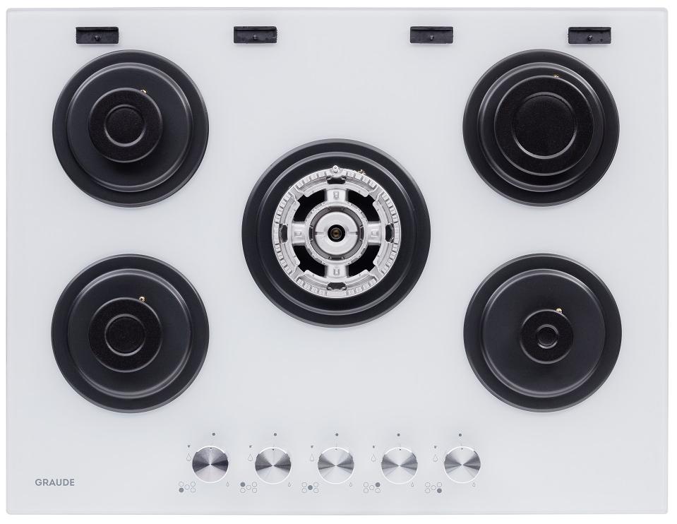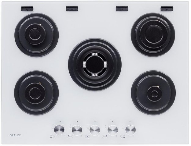 Элегантная модель от Graude — это гармоничное сочетание белого стекла и черного чугуна. Поверхность легко очищается от загрязнений, а решетки легко снимаются для мытья. Пять высокоэффективных конфорок разной мощности позволяют подобрать оптимальный вариант под любую посуду. Благодаря плавному ходу ручек обеспечивается точная настройка мощности пламени. За безопасность отвечает система газового контроля, которая блокирует подачу газа, если пламя у конфорки погаснет. Автоматический поджиг интегрирован в каждый регулятор. Встраиваемая модель смотрится стильно и современно в кухонном гарнитуре.