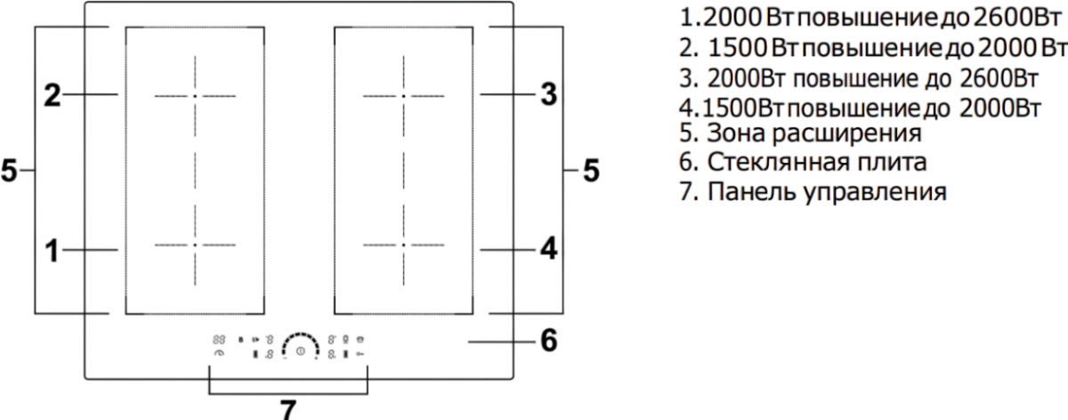 Элементы управления варочной панелью позволяют включать и выключать прибор, регулировать интенсивность нагрева, активировать дополнительные функции — временно увеличивать мощность, подключать контуры расширения конфорок, объединять зоны нагрева, задействовать защиту от детей, экстренно выключать все конфорки сразу и многое другое.