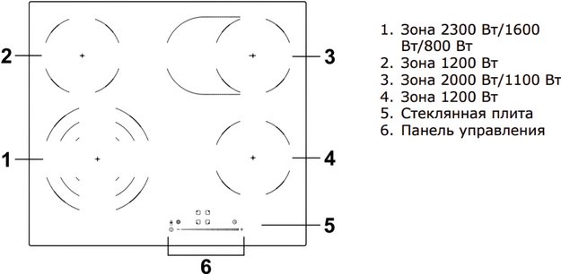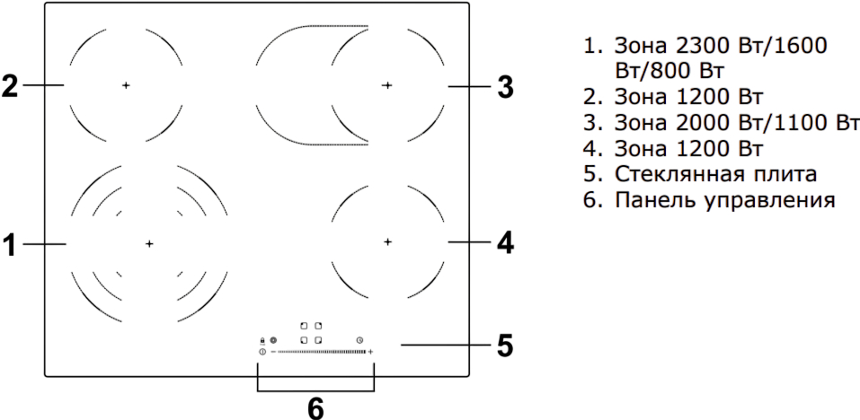 Элементы управления варочной панелью позволяют включать и выключать прибор, регулировать интенсивность нагрева, активировать дополнительные функции — временно увеличивать мощность, подключать контуры расширения конфорок, объединять зоны нагрева, задействовать защиту от детей, экстренно выключать все конфорки сразу и многое другое.
