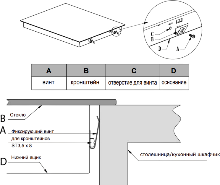 Варочные панели встраиваются в столешницу: они могут располагаться как заподлицо, так и выступать над ее поверхностью. Особенности их расположения зависят от высоты (толщины) варочной панели, а та определяется, как правило, видом нагрева, материалом поверхности и типом подключения — зависимым или независимым.