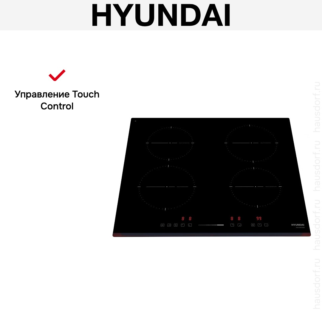 Индукционная варочная панель Hyundai HHI-6741-BG сочетает лаконичный чёрный стиль и практичную эргономику для современной кухни. Компактный корпус шириной 59 см и высотой 52 см с глубиной всего 5.6 см обеспечивает аккуратную интеграцию в шкафы. Безрамочная поверхность со скошенным краем создаёт ощущение монолитности и упрощает уход по краям. Ниша для встраивания 55.5×49.5 см и глубина монтажа 49.5 см позволяют установить прибор практически в любой столешнице.