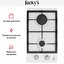 Цвет — белый. Благодаря отсутствию рамки она отлично впишется в интерьер и не займет лишнее место на столешнице, которое можно использовать для работы. Открытый огонь не страшен ни вашей посуде, ни вам, так как горелки надежно закрыты решетками. Материал самой поверхности: эмалированная сталь. Управление этой моделью механическое. Для переключения уровней нагрева, выбора функций используются следующие переключатели: поворотные. Простая система контроля за прибором делают его более универсальным, ведь разобраться сможет кто угодно.