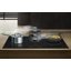 Вытяжка, встроенная в варочную панель — достаточно удобный вариант, позволяющий сэкономить место в кухне. Такая конструкция позволяет лучше улавливать испарения, не давая им распространяться по всему помещению, и способствует более качественной очистке воздуха. Большинство подобных моделей может работать только в режиме рециркуляции воздуха, с удалением капель жира, сажи, неприятных запахов при помощи системы фильтров. Работу в режиме отвода загрязненного воздуха через систему вентиляции организовать довольно сложно, поскольку вытяжка располагается низко над полом. Часто варочная панель находится на кухонном острове, что также мешает присоединению к вентиляции. Еще одна особенность подобных моделей состоит в том, что под варочной панелью нельзя разместить духовку или другую технику, так как место будет занято.